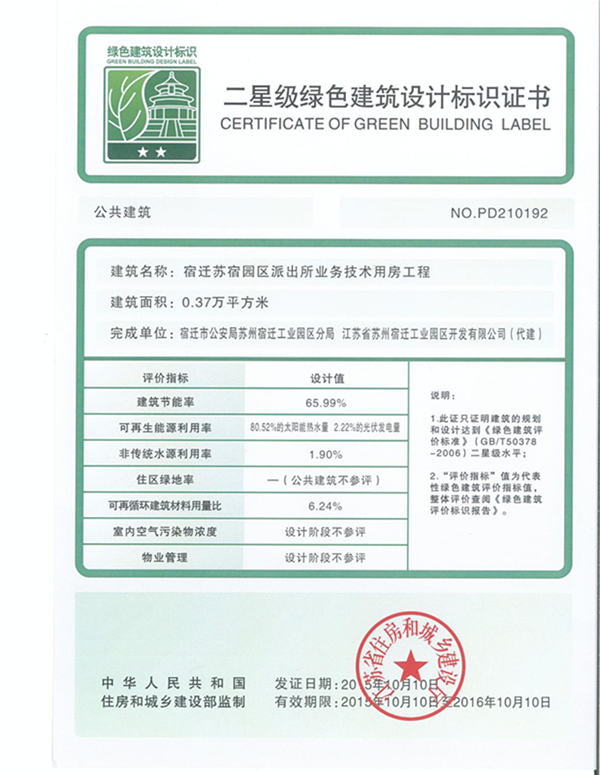 近日,由開發(fā)公司代建的蘇宿園區(qū)派出所業(yè)務技術用房工程,順利通過國家二星級綠色建筑設計標識認證。