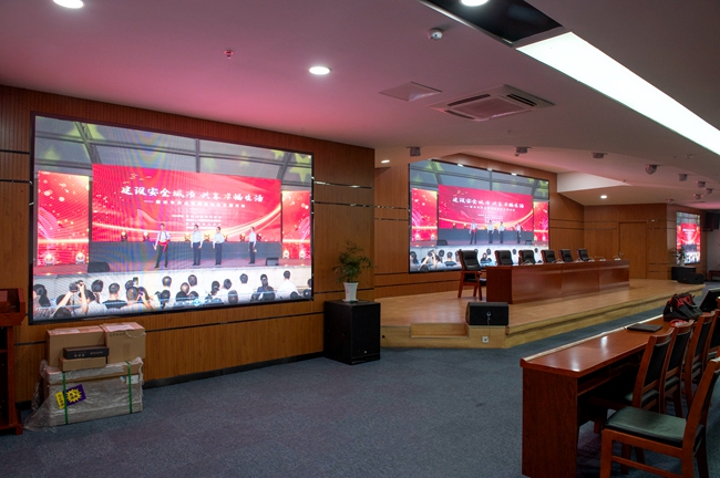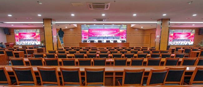經(jīng)過改造,安全教育館新增3塊LED屏幕,其中主席臺處主LED顯示屏面積約20平方,東西兩側(cè)輔助LED顯示屏各約6平方。LED屏幕采用顯示單元像素間距為P2-2.5,具有顯示面積大、分辨率高、超高對比度、超寬視角、無縫拼接、維護(hù)方便等優(yōu)點(diǎn)。改造后進(jìn)一步提升了視頻會(huì)議效果,增加了會(huì)場多功能性。