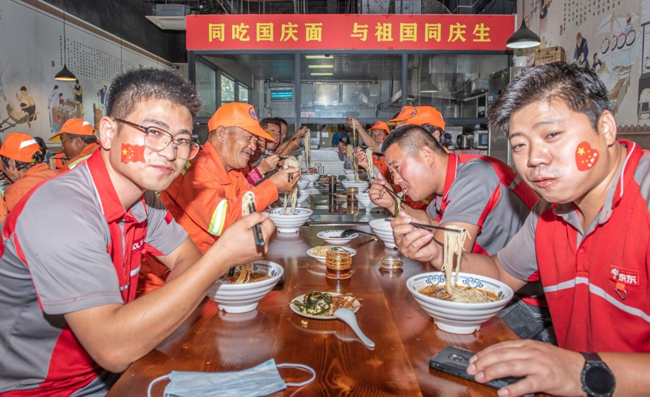 一碗“國慶面”,一份愛國情。當一碗碗熱氣騰騰、香氣撲鼻的面條送到環(huán)衛(wèi)工人、快遞小哥等堅守在一線崗位上的工作人員手中,大家接過面條,享用著寓意美好的“國慶面”,每個人的臉上都洋溢著幸福和快樂的笑容。大家用最樸素最平常的食物,表達了對祖國母親生日快樂的真摯情感。