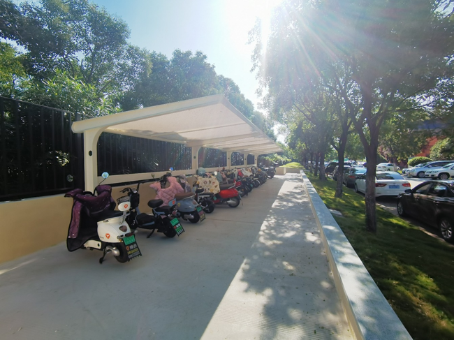 本次共建設(shè)17處膜結(jié)構(gòu)車棚,總約1100m2,共可停放380余輛非機(jī)動車,新車棚干凈明亮、設(shè)施齊全,既解決了停車需求,又消除了工業(yè)坊內(nèi)的電動車安全隱患,得到了進(jìn)駐工友的一致好評。