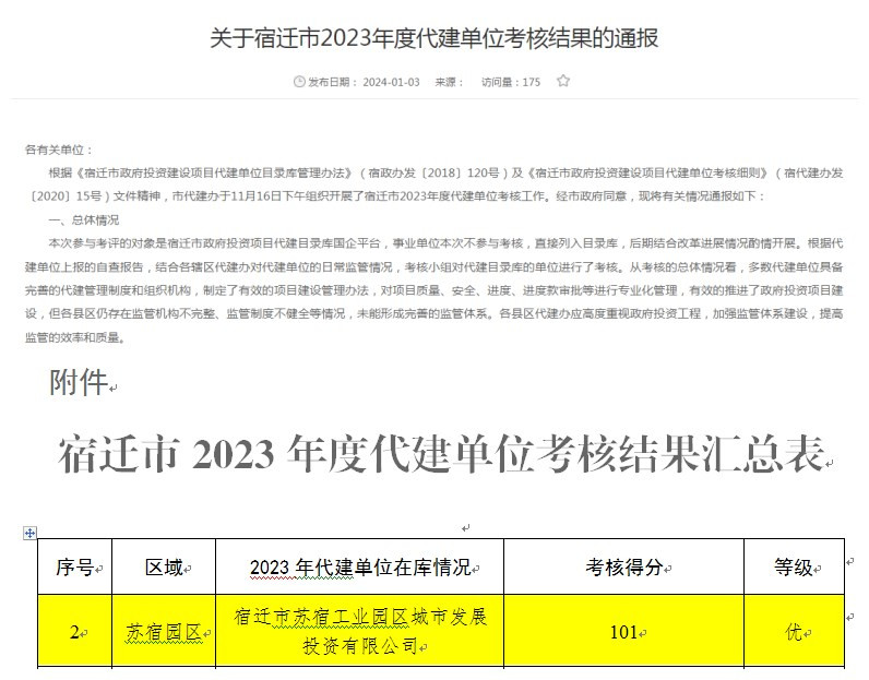 近日,經(jīng)市政府同意,由宿遷市政府投資建設(shè)項(xiàng)目代建管理辦公室通報(bào)宿遷市2023年度代建單位考核工作結(jié)果,城發(fā)公司以101分高分通過本次考核。