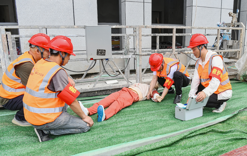 應(yīng)急演練現(xiàn)場(chǎng)模擬了一名施工人員,在安裝外墻鋁板作業(yè)過(guò)程中,因違反安全技術(shù)交底要求擅自改變作業(yè)程序,不慎從高處墜落受傷。安全員發(fā)現(xiàn)該情況后,立即上報(bào),隨即應(yīng)急救援預(yù)案迅速啟動(dòng),各小組聯(lián)合行動(dòng),通過(guò)科學(xué)有序的救援,及時(shí)將傷者送醫(yī)救治,整個(gè)演練過(guò)程井然有序。通過(guò)演練提高了員工應(yīng)急自救能力,減少高空墜落事故的發(fā)生,并在發(fā)生時(shí)能及時(shí)有效地進(jìn)行自救和互救。