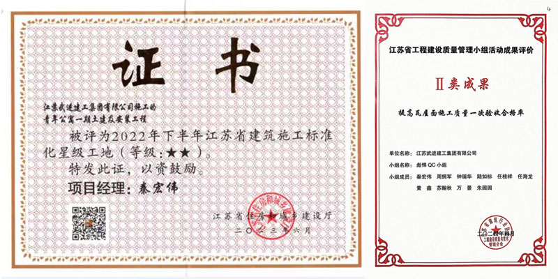 項(xiàng)目在施工中先后獲得了江蘇省建筑施工標(biāo)準(zhǔn)化星級(jí)工地、江蘇省綠色施工示范工程、宿遷市工程質(zhì)量管理小組活動(dòng)II類(lèi)成果、江蘇省工程建設(shè)質(zhì)量管理小組活動(dòng)成果評(píng)價(jià)II類(lèi)成果等榮譽(yù),同時(shí)受到了主管部門(mén)、業(yè)界同行的充分肯定。