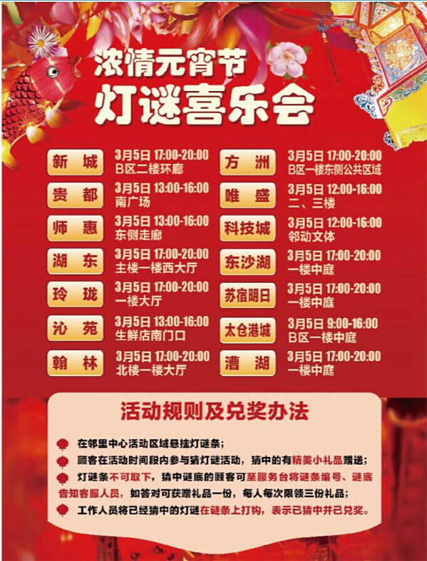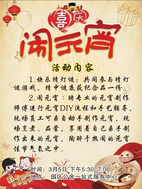 元宵節(jié)期間,園區(qū)公舍、蘇宿明日鄰里中心均為廣大園區(qū)居民奉上了精彩活動(dòng),有獎(jiǎng)品多多的“快樂猜燈謎”,還有專業(yè)的元宵DIY現(xiàn)場(chǎng)輔導(dǎo),歡迎園區(qū)居民和工友們前來參加。