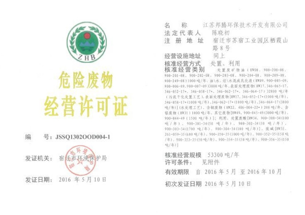近日,園區(qū)江蘇邦騰環(huán)保技術(shù)開(kāi)發(fā)有限公司獲頒由宿遷市環(huán)保局頒發(fā)的危險(xiǎn)廢物經(jīng)營(yíng)許可證,主要從事利用、處置廢礦物油、廢酸、廢堿、表面處理廢物等,處理量為53300噸/年。