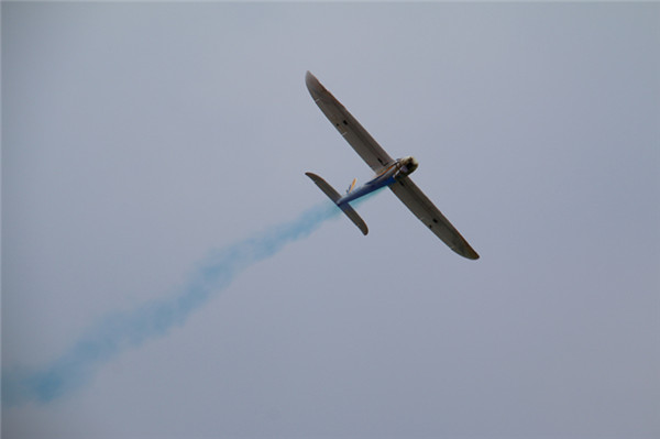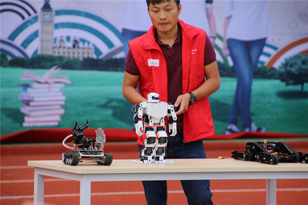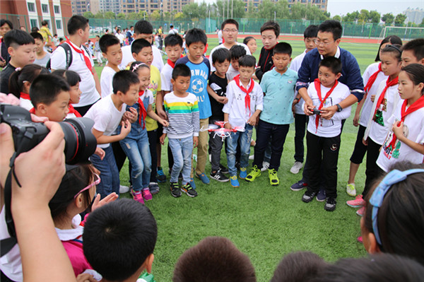 表演中,兩臺多軸飛機在場地作繞場及8字飛行,在飛行4分鐘后,隨著背景的高潮音樂響起,在空中打開了橫幅——“共創(chuàng)文明社區(qū),締造幸福家園?!彪S后,無論是機器人的介紹演示、固定翼無人機的拉煙表演還是直升機表演,又或是像真機空中格斗飛行,都讓同學們在互動和操作中充分感受到了科技的飛速發(fā)展,拓展了視野,更對航空模型制作產生了濃厚的興趣。